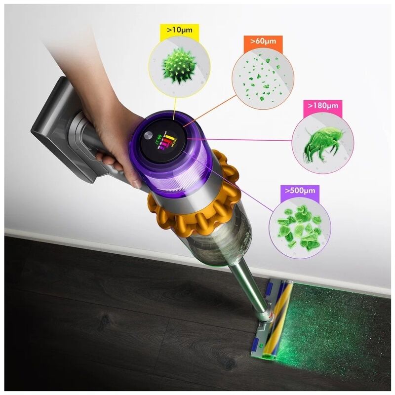 Усовершенствованная система фильтрации Dyson для всей машины задерживает 99,99 % мелкой пыли размером до 0,3 микрона.