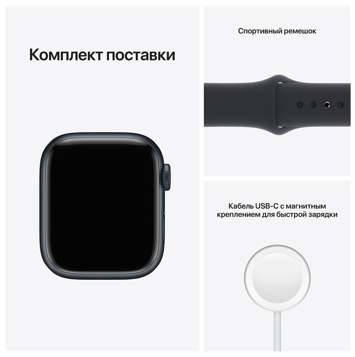 Часы: Корпус из алюминия. Спортивный ремешок (размер нужно выбрать из наличия при заказе устройства). Зарядный кабель с магнитным креплением (1 м). |